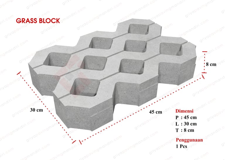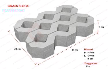 Grass Block adalah paving block dengan rongga terbuka yang memungkinkan rumput atau tanaman tumbuh di sela-selanya. Produk ini dirancang untuk menciptakan permukaan yang kuat sekaligus tetap menjaga daya serap air tanah, sehingga cocok untuk area hijau dan lingkungan yang membutuhkan sistem drainase alami.